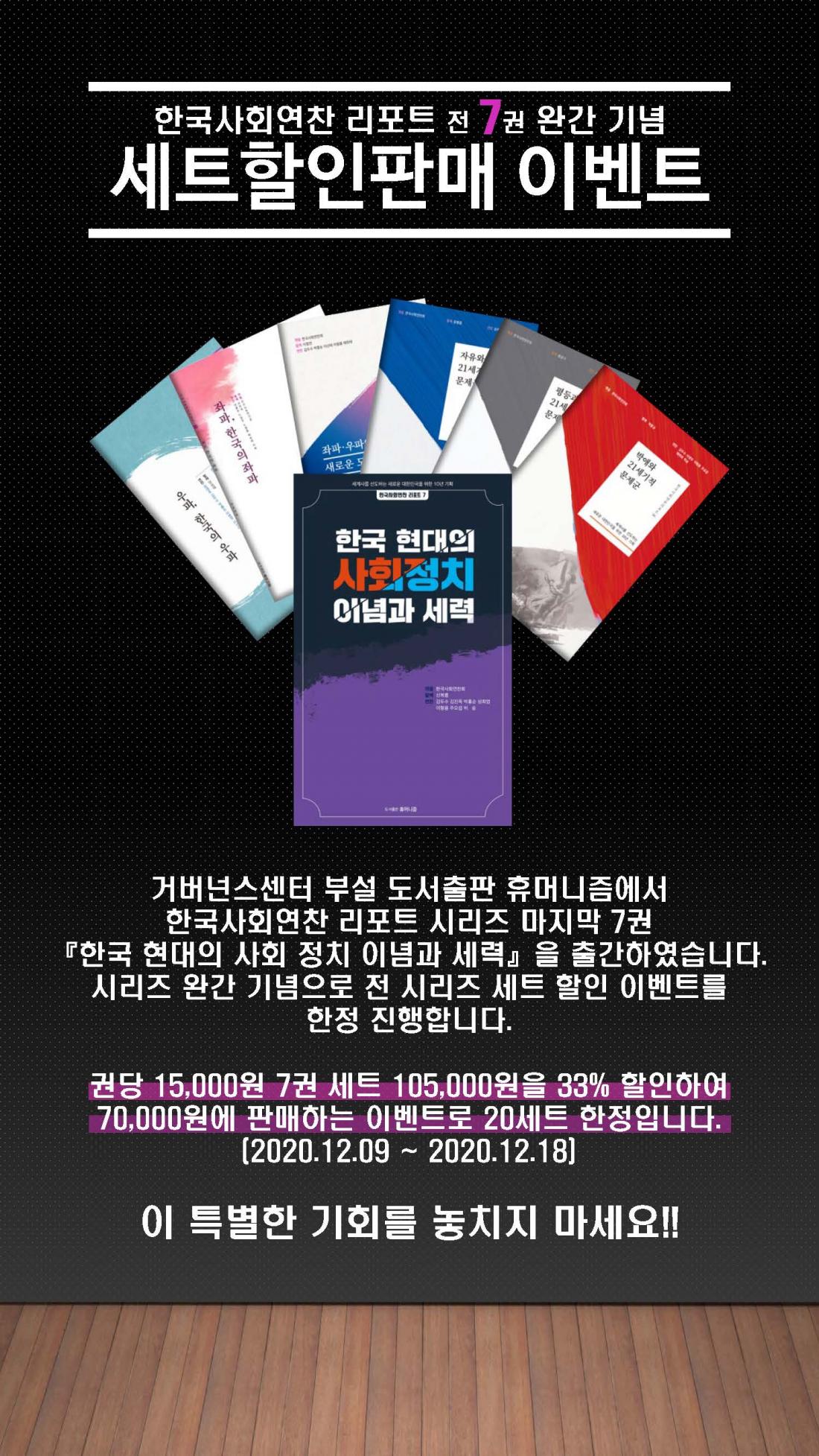 Çѱ¹»çȸ¿¬Âù ¸®Æ÷Æ® Àü 7±Ç ¿Ï°£ ±â³ä ¼¼Æ®ÇÒÀÎÆÇ¸Å À̺¥Æ®¸¦ 12¿ù 9ÀϺÎÅÍ 18ÀϱîÁö ÁøÇàÇÕ´Ï´Ù!! °ü½É°ú ÇÔ²² Ưº°ÇÑ ±âȸ¸¦ ÀÌ¿ëÇϽñ⠹ٶø´Ï´Ù. (20¼¼Æ® ÇÑÁ¤ À̺¥Æ®ÀÔ´Ï´Ù.) * ¼¼Æ® ±¸ÀÔ ¹æ¹ý : ¾Æ·¡ °èÁ·ΠÀÔ±ÝÇϽðí, ¹®ÀÚ³ª À̸ÞÀÏ·Î ±¸ÀÔÀÚ, ±¸ÀÔ ¼¼Æ®¼ö, ¹ÞÀ¸½Ç ÁÖ¼Ò, ÀÔ±ÝÀÚ ¸íÀ» º¸³»ÁÖ½Ã±æ ¹Ù¶ø´Ï´Ù. °èÁ : ¿ì¸®ÀºÇà 1005-602-464667 (»ç)°Å¹ö³Í½º¼¾ÅÍ E-mail: governance21@naver.comd / H.P.) 010-5805-2252 ¹®ÀÇ ÀüÈ 02) 396-2252, *ÀÚ¼¼ÇÑ Ã¥ ¼Ò°³ ¹× °³º° ±¸¸Å¸¦ ¿øÇϽŴٸé? 1±Ç¡º¿ìÆÄ, Çѱ¹ÀÇ ¿ìÆÄ¡» ¹ßÁ¦_ ¾ç½ÂÅÂ(ÀÌÈ¿©´ë ¸í¿¹±³¼ö, Àü Çѱ¹Á¤Ä¡»ç»ó»çÇÐȸ ⸳ȸÀå) ³×À̹ö Ã¥¼Ò°³ ¸µÅ© https://book.naver.com/bookdb/book_detail.nhn?bid=15207618