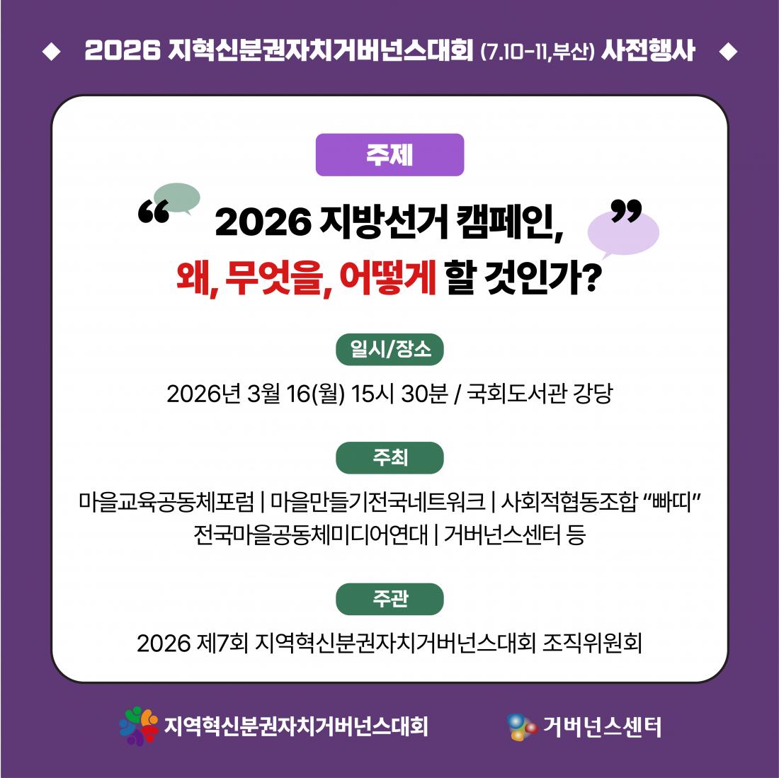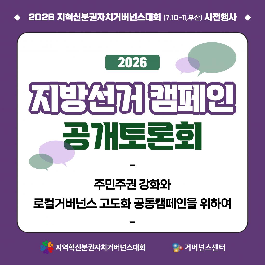 3¿ù 16ÀÏ ±¹È¸µµ¼°ü °´ç¿¡¼ <2026 Áö¹æ¼±°Å Ä·ÆäÀÎ °ø°³Åä·Ðȸ> -ÁÖ¹ÎÁÖ±Ç °È¿Í ·ÎÄðŹö³Í½º °íµµÈ °øµ¿Ä·ÆäÀÎÀ» À§ÇÏ¿©-¸¦ °³ÃÖÇÕ´Ï´Ù. 7¿ù 10-11ÀÏ¿¡ ºÎ»ê¿¡¼ ¿¸®´Â 2026 Á¦7ȸ ÁöÇõ½ÅºÐ±ÇÀÚÄ¡°Å¹ö³Í½º´ëȸÀÇ »çÀüÇà»çÀÔ´Ï´Ù. ÀÚ¼¼ÇÑ ³»¿ëÀº ÃßÈÄ¿¡ °øÁöÇϰڽÀ´Ï´Ù.