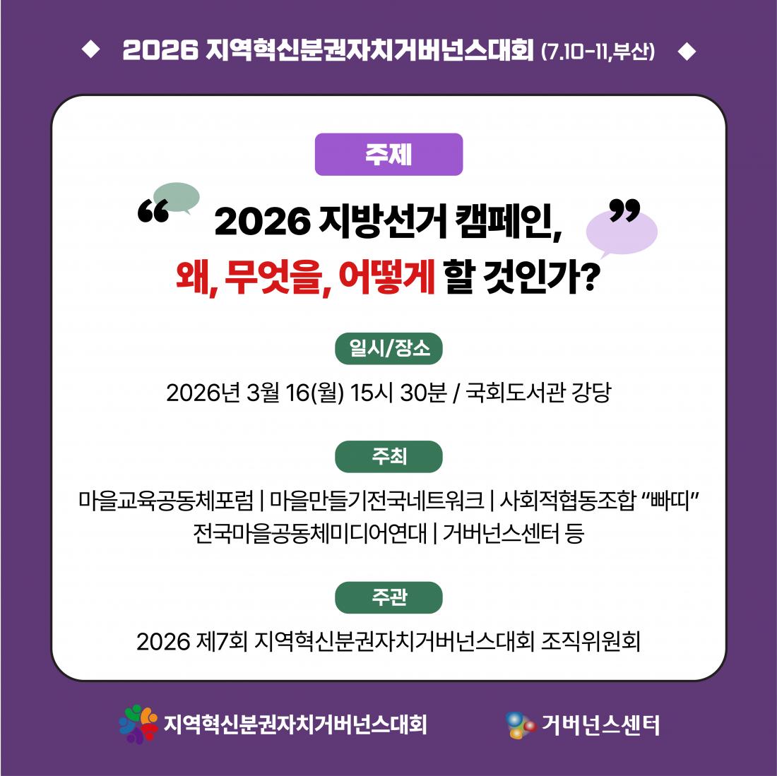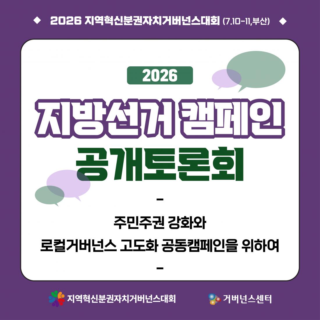 3¿ù 16ÀÏ(¿ù) ±¹È¸µµ¼°ü °´ç¿¡¼ <2026 Áö¹æ¼±°Å Ä·ÆäÀÎ °ø°³Åä·Ðȸ> -ÁÖ¹ÎÁÖ±Ç °È¿Í ·ÎÄðŹö³Í½º °íµµÈ °øµ¿Ä·ÆäÀÎÀ» À§ÇÏ¿©-¸¦ °³ÃÖÇÕ´Ï´Ù. 7¿ù 10ÀÏ-11ÀÏ¿¡´Â ºÎ»ê¿¡¼ '°Å¹ö³Í½º °íµµÈ¿Í ¹Î¼± 9±â ºÐ±ÇÀÚÄ¡'¸¦ ´ëÁÖÁ¦·Î 2026 Á¦7ȸ Áö¿ªÇõ½ÅºÐ±ÇÀÚÄ¡°Å¹ö³Í½º´ëȸ¸¦ °³ÃÖÇÕ´Ï´Ù. ÀÚ¼¼ÇÑ ³»¿ëÀº ÃßÈÄ¿¡ °øÁöÇϰڽÀ´Ï´Ù.