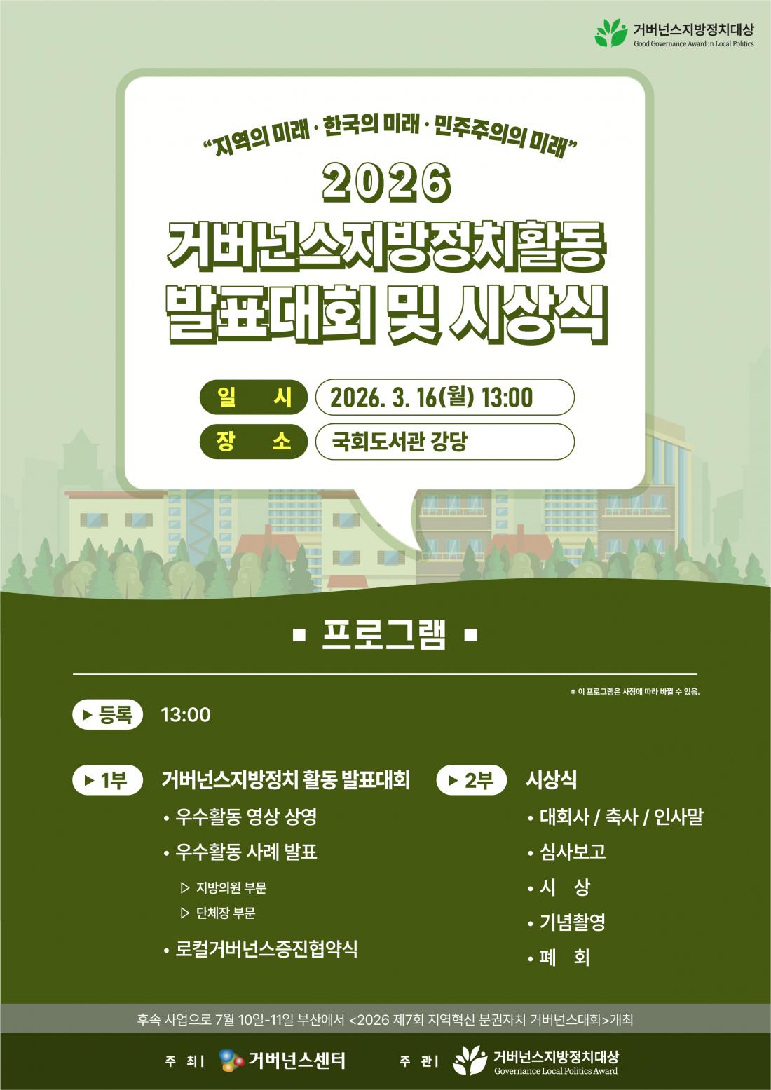 ¾È³çÇϼ¼¿ä. 3¿ù 16ÀÏ ±¹È¸µµ¼°ü °´ç¿¡¼ <2026 °Å¹ö³Í½º Áö¹æÁ¤Ä¡È°µ¿ ¹ßÇ¥´ëȸ ¹× ½Ã»ó½Ä>ÀÌ ¿¸³´Ï´Ù. ¶ÇÇÑ, ÈÄ¼Ó ¿¬°è »ç¾÷À¸·Î 7¿ù 10ÀÏ(±Ý)-11ÀÏ(Åä)¿¡ ºÎ»ê¿¡¼ <2026 Á¦7ȸ ÁöÇõ½ÅºÐ±ÇÀÚÄ¡°Å¹ö³Í½º´ëȸ>¸¦ °³ÃÖÇÕ´Ï´Ù. ¸¹Àº °ü½É°ú Âü¿©¹Ù¶ø´Ï´Ù.